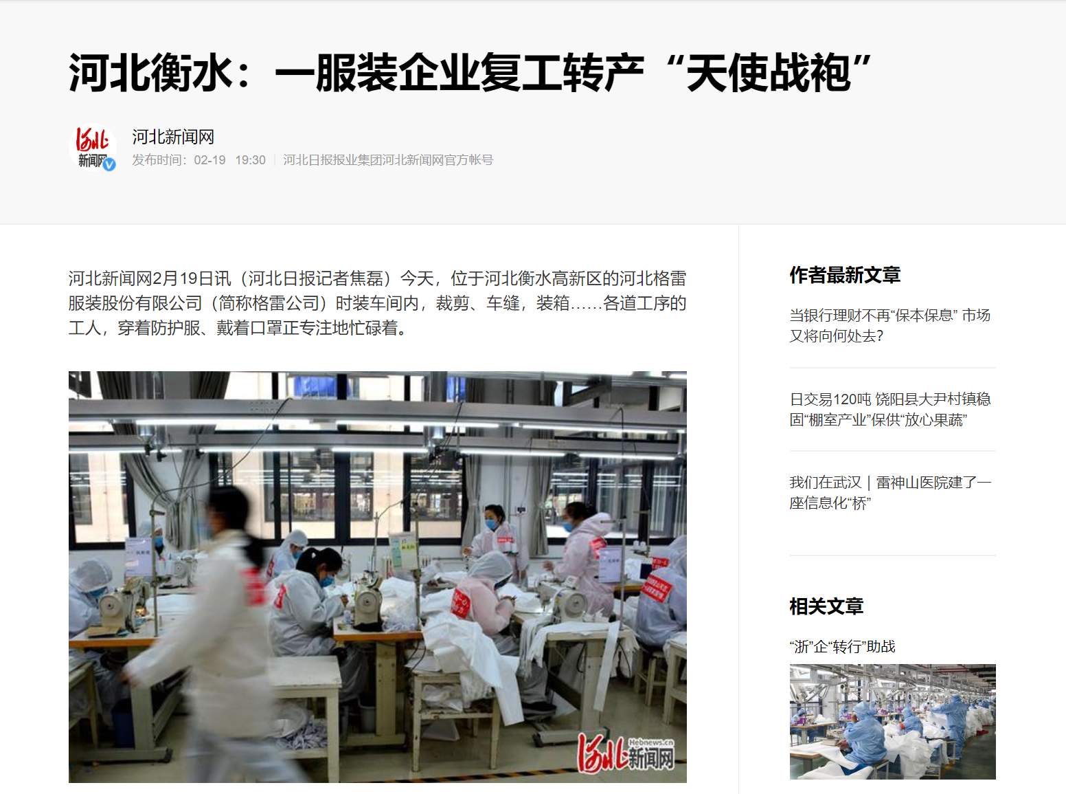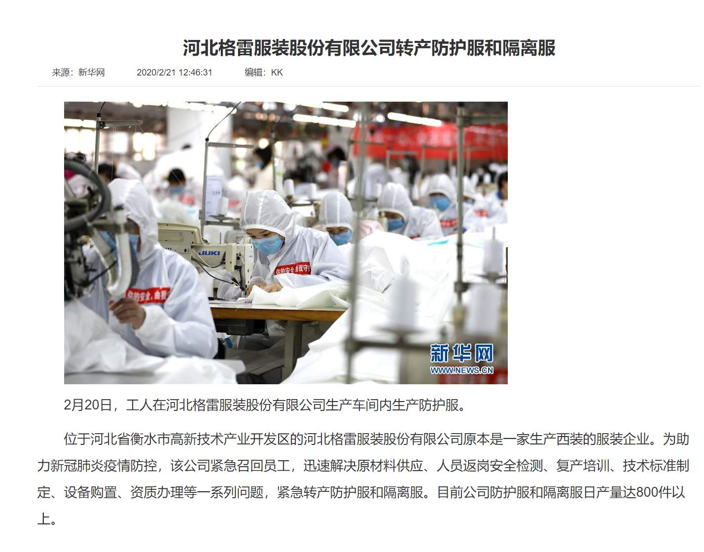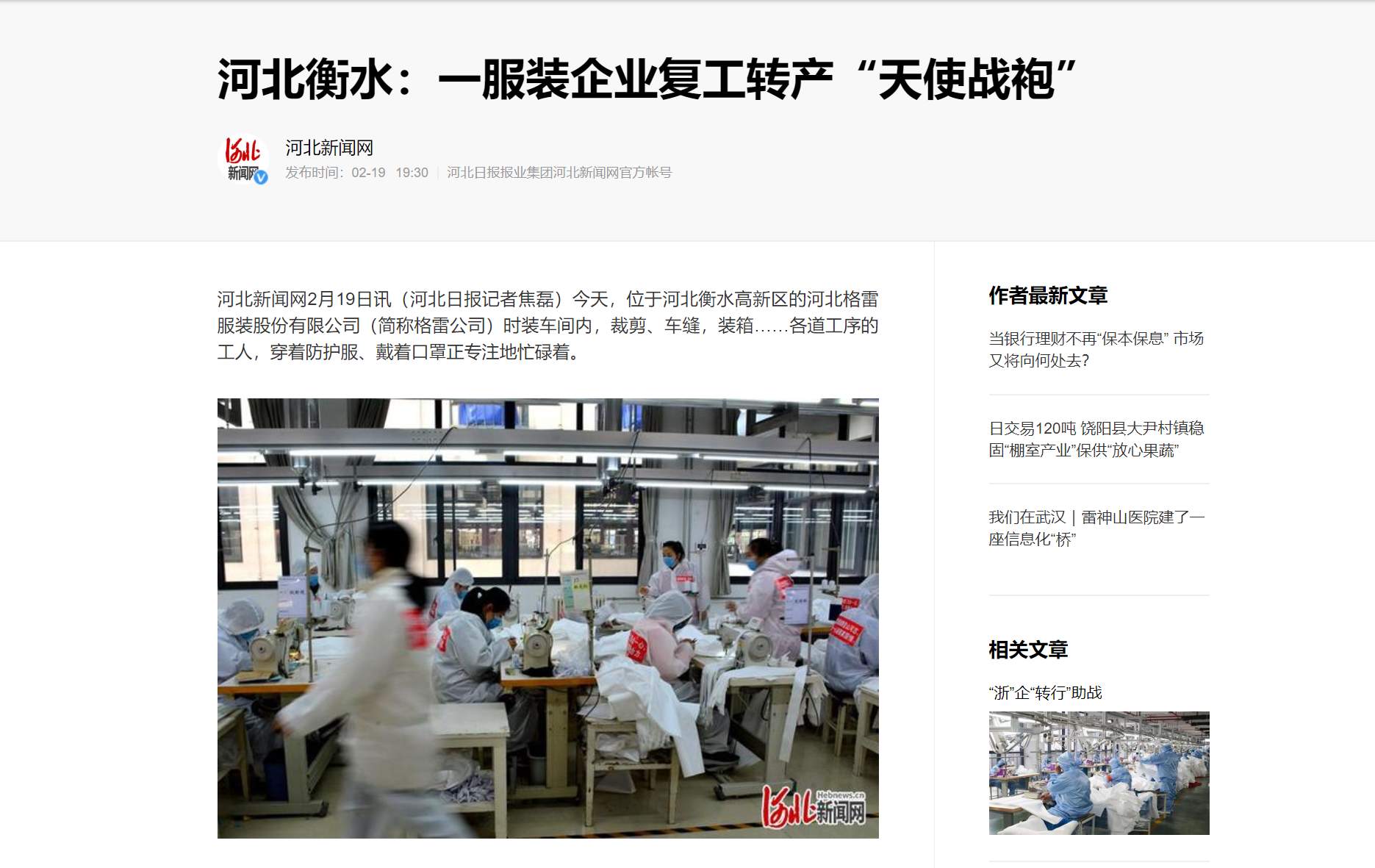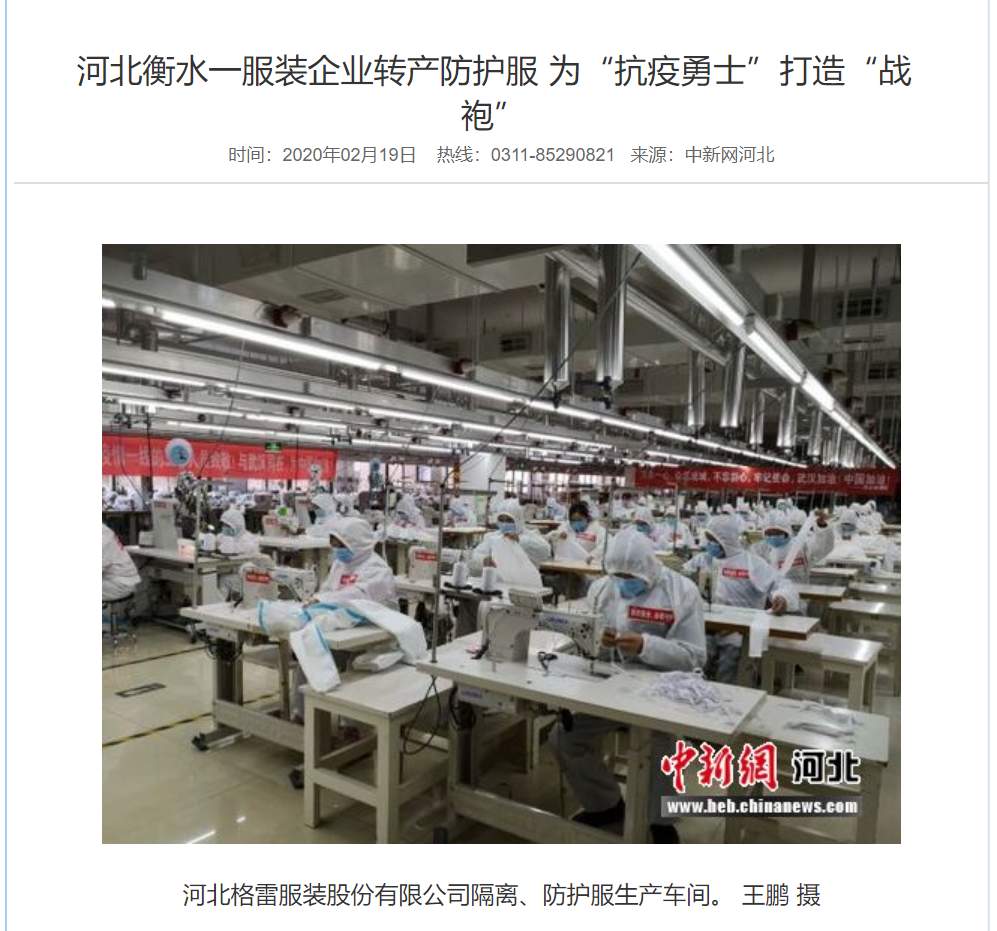 近日,河北格雷轉產抗疫的新聞風靡國內外各大媒體,點擊量累計突破百萬。大家對河北格雷逆行而上的勇氣和責任擔當給予了高度評價。